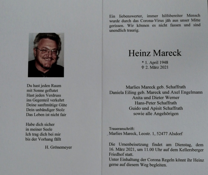 Dies ist ihm aber durch das Corona-Virus nur eine viel zu kurze Zeit vergönnt gewesen. Nun hat er seine letzte Reise auf dieser Erde angetreten.